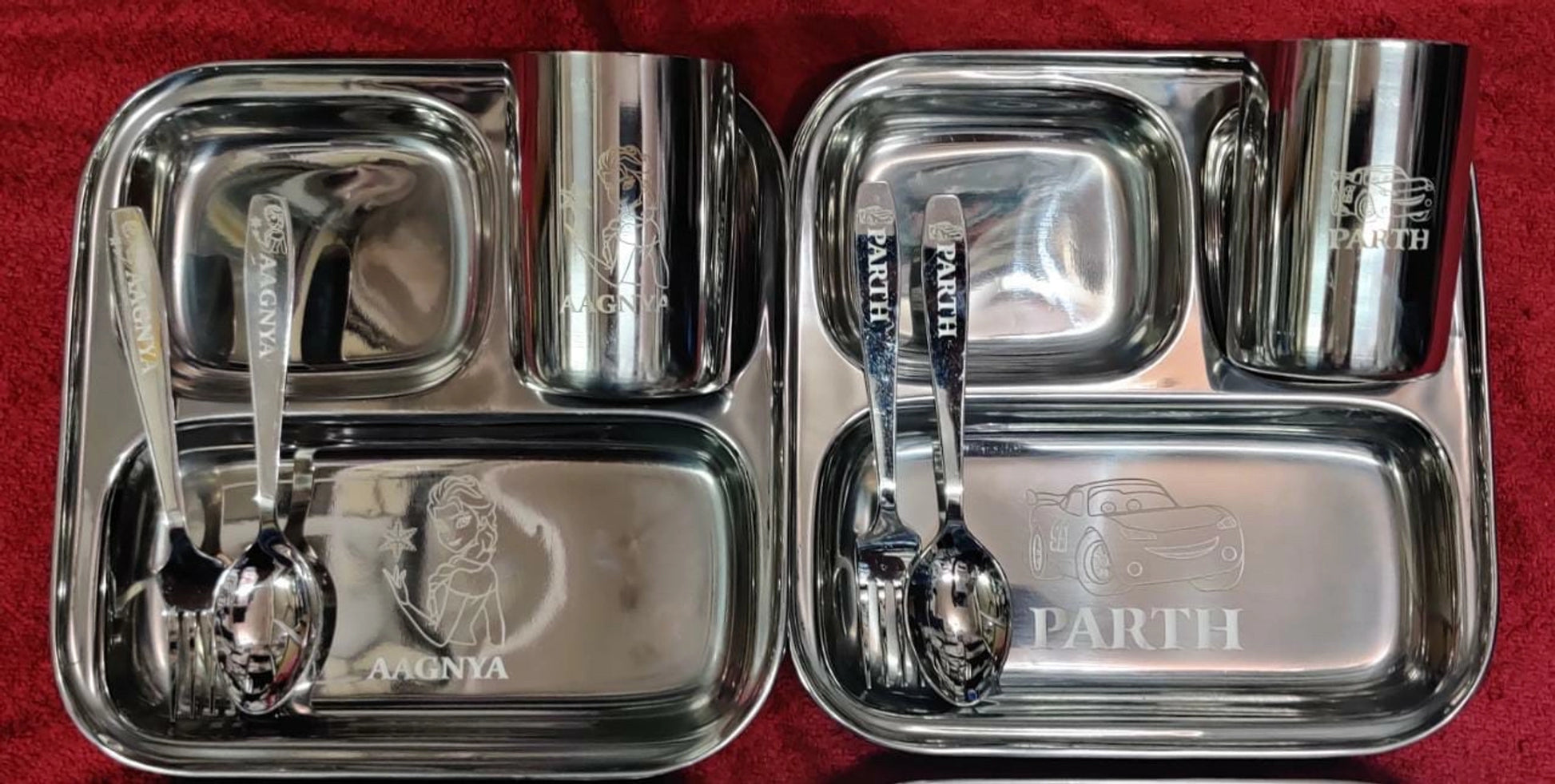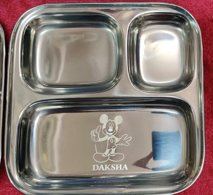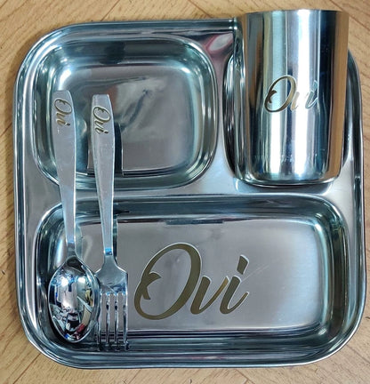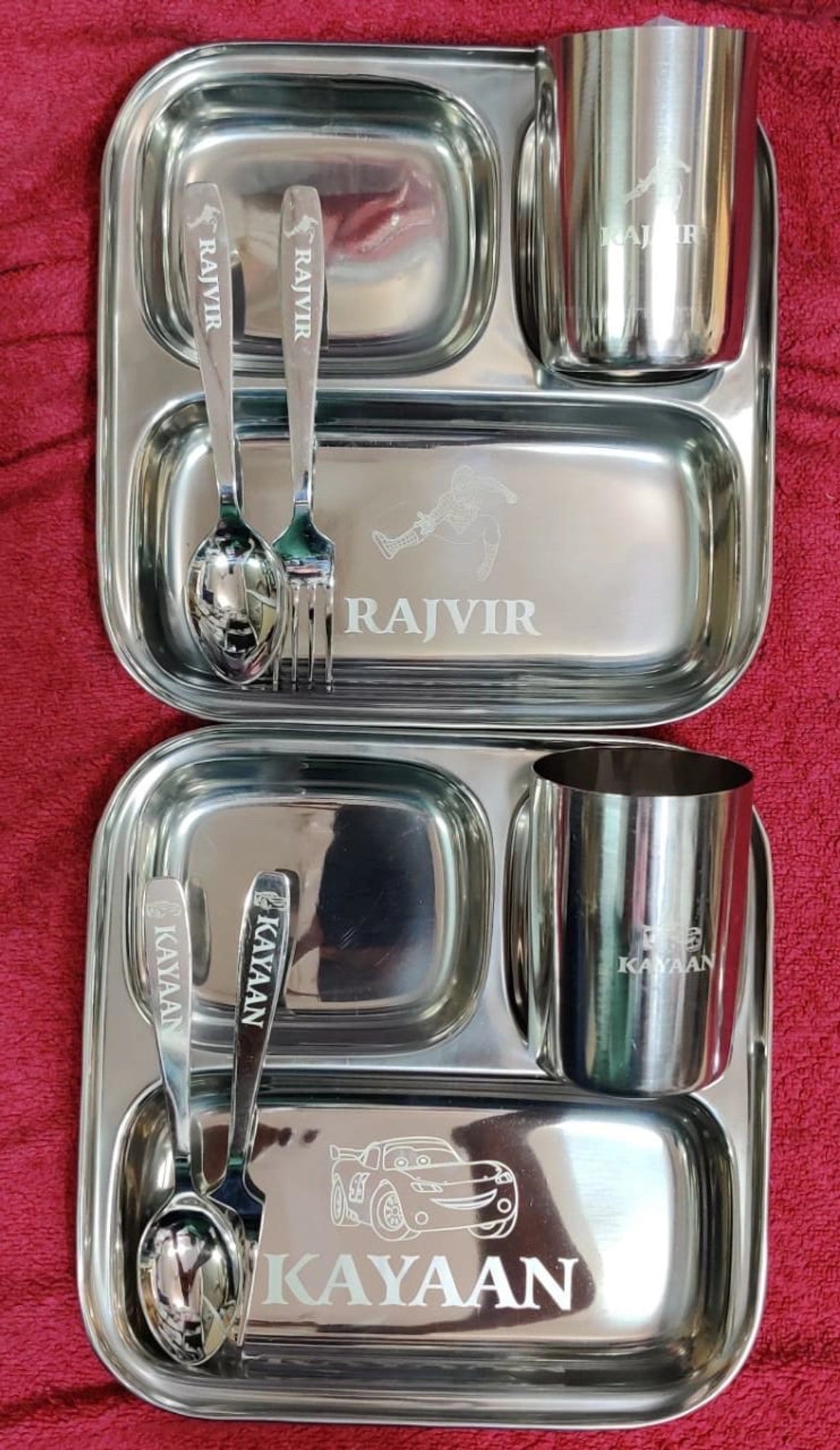 Can be done in any theme Contains: 3 partition plate 1 glass 1 spoon 1 fork All above products will be with Name and Design