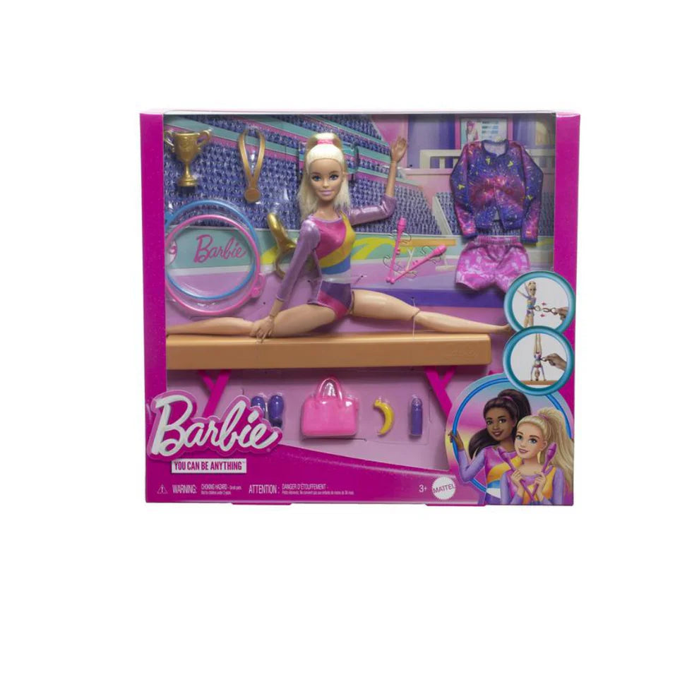 Includes 1 Barbie doll wearing leotard, 1 c-clip, 1 balance beam, 2 batons, 2 hoops, 1 water bottle, 1 banana, 1 trophy, 1 medal, 1 gym bag, 1 jacket, 1 pair of shorts and 1 pair of sneakers.