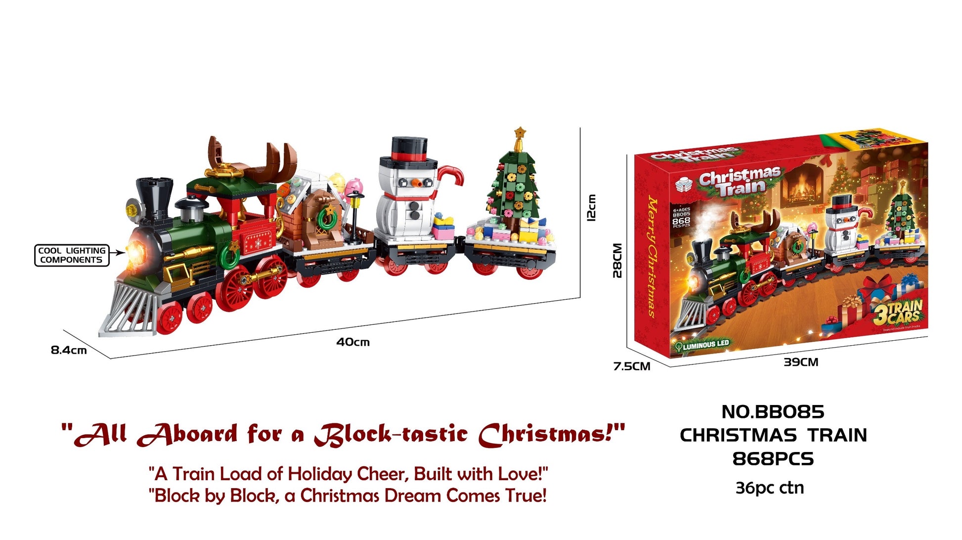 Festive Design: Features a Christmas-themed train with vibrant holiday colors and decorations, including a reindeer engine, a snowman, and a festive Christmas tree.