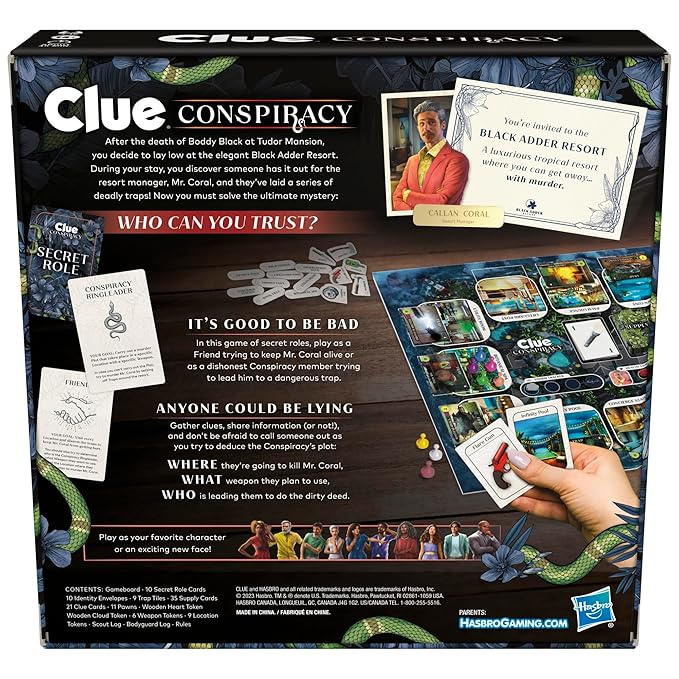 - THE ADULT VERSION OF CLUE YOU'VE BEEN WAITING FOR: Lie to your friends, get away with murder! The Clue Conspiracy game is a secret role strategy game of shifting suspicions—with a party vibe! Ages 14+. For 4-10 players