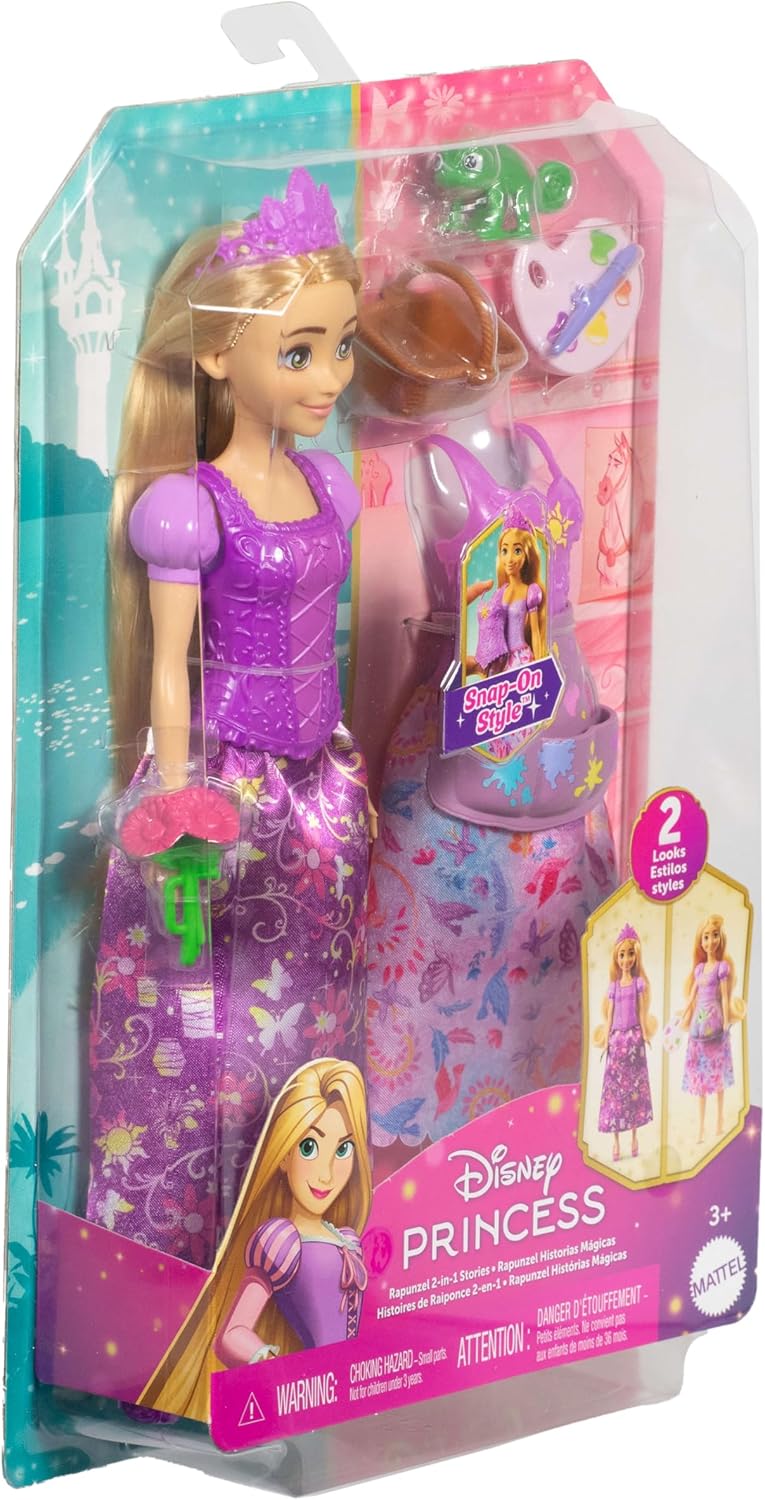 - Disney Princess 2-in-1 Stories Rapunzel fashion doll set has themed fashions and accessories for kids to play out two unique stories!
