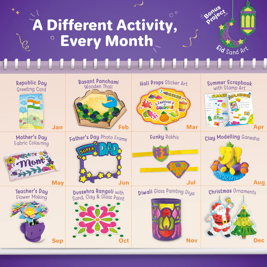 - A COMPLETE CRAFT KIT FOR THE YEAR: This DIY kit comes with everything you need from the markers to the Colours. With each activity designed to have a wonderful creation for each festival around the year. This kit not only nurtures creativity, problem solving and motor skills but also boosts the self confidence of kids as they are able to independently create a variety of masterpieces