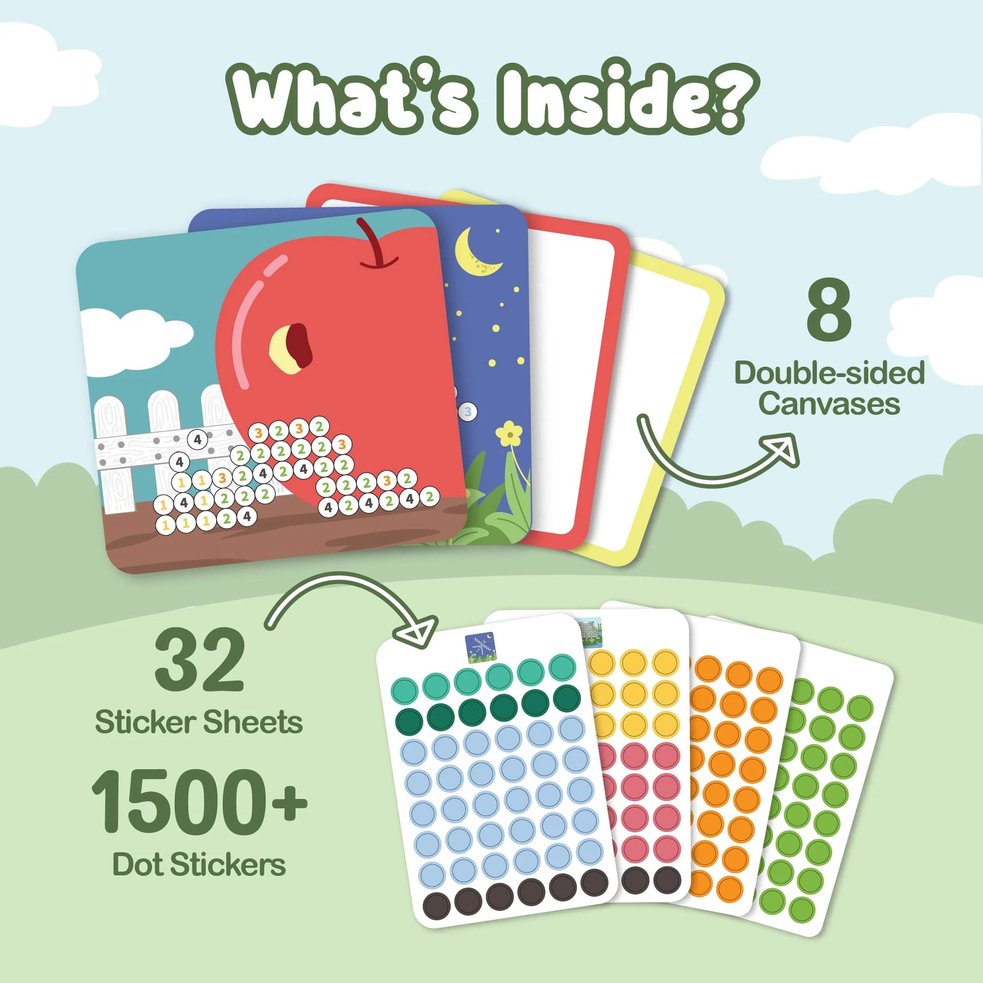 WHAT'S INSIDE: 8 Double-Sided Canvases, 32 Easy to Peel Sticker Sheets (1500+ stickers) & 1 Rules Sheet