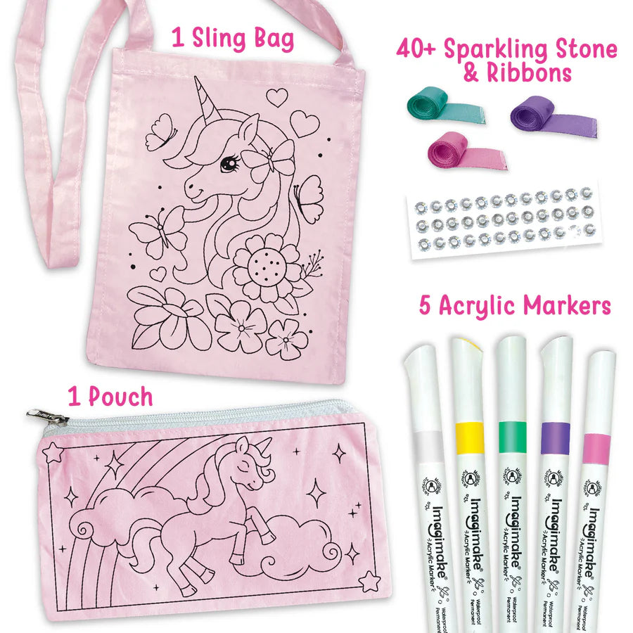 - FUN DIY FABRIC ART KIT FOR KIDS – Creative unicorn-themed art & craft kit that lets girls colour, design, and decorate their own stylish sling bag and zipper pouch.