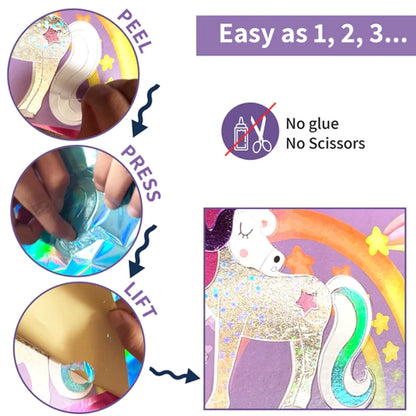 Making pictures is as easy as 1-2-3. Select a picture, and peel a section off to reveal the sticky area. Lay a foil over it and press. Lift up the foil sheet. The sparkly foil will transfer to your picture with no glue needed.