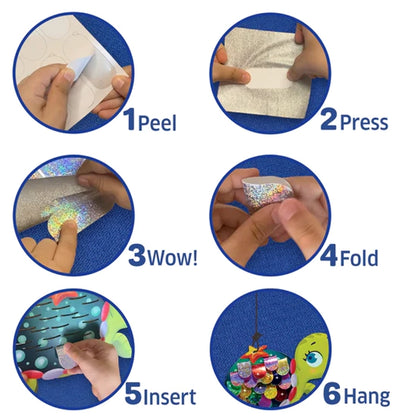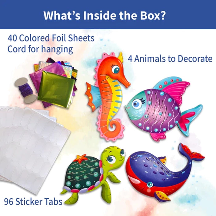 Make super shiny hangings by rubbing sparkling foil onto adhesive tabs. The finished results look fabulous on display! Foil Decorations Sea Animals comes with 4 picture boards featuring beautiful images with slits ready to have glittering coloured foil added from the 40 sheets included in the kit. Each animals measures approximately 9-10 inches.