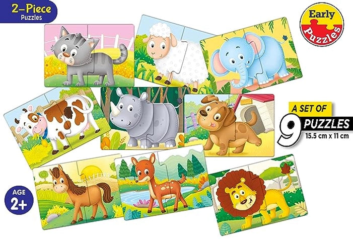 - Contains 9 colourful animal puzzles of 2 pieces each