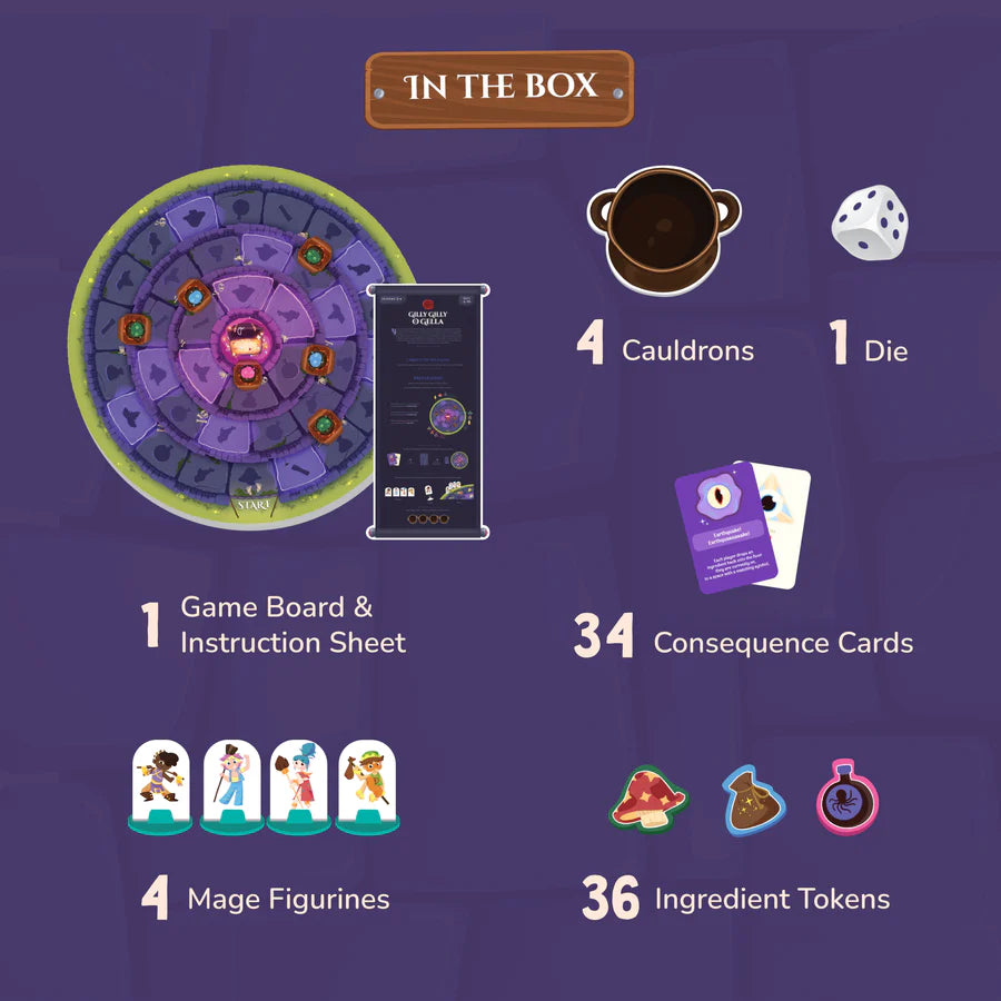 • IN THE BOX - 1 Game board, 4 Mage figurines, 4 Cauldrons, 36 Ingredient tokens, 34 Consequence cards, 1 Die, 1 Instruction sheet.