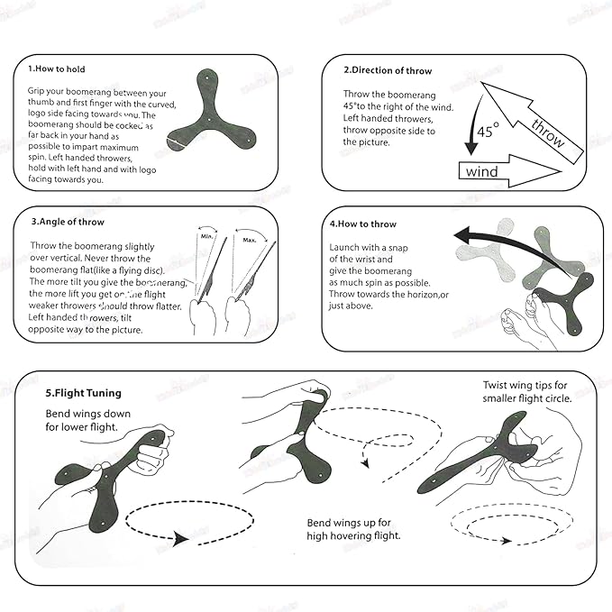 - ๐ฏ Skill Development and Precision Practice: Master the art of boomerang operation with skill and precision. Step-by-step instructions provided on packaging for easy learning and effective usage. Perfect for both beginners and experienced boomerang flyers.