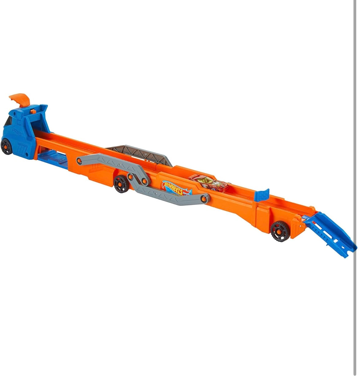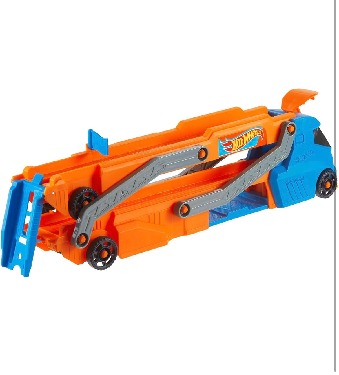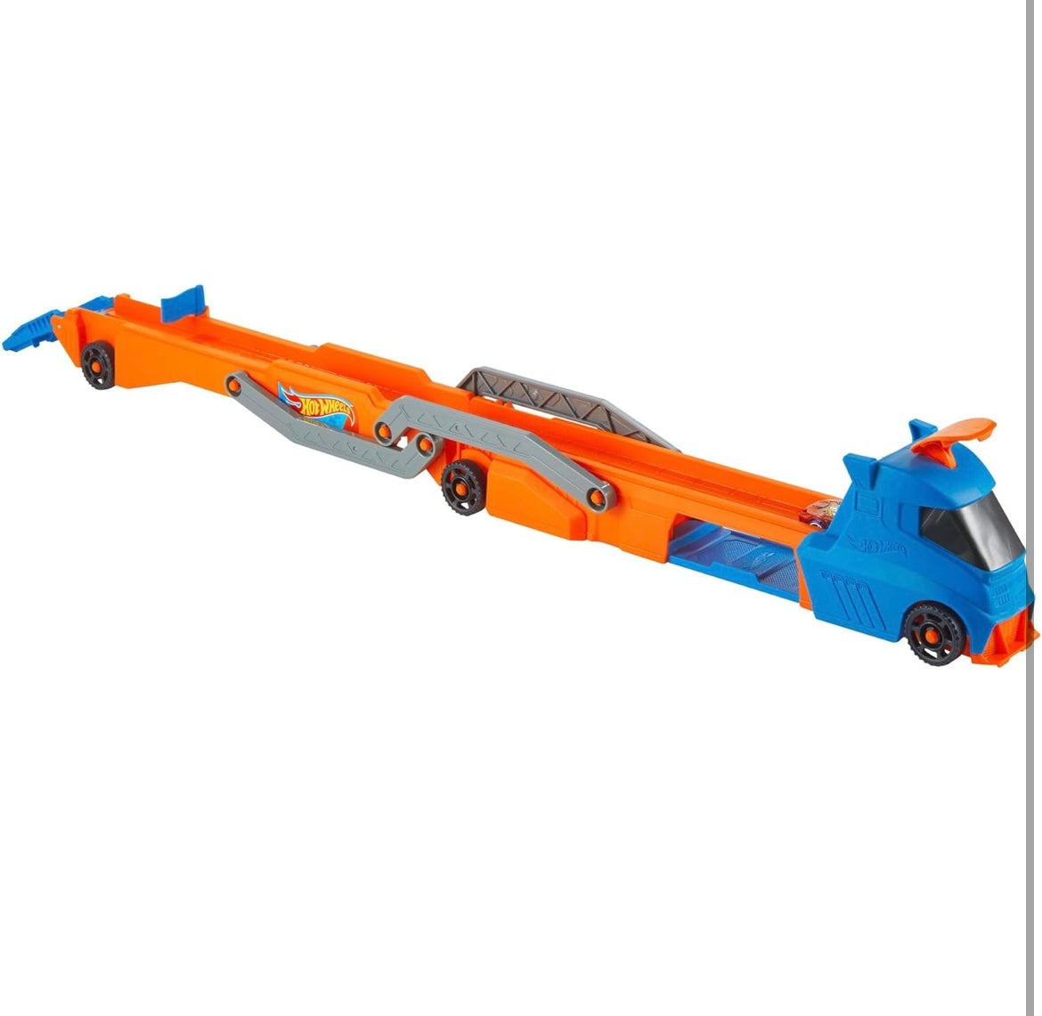 Hot Wheels Toy Car, Truck, Hauler & Track with 1:64 Scale Toy Car, Large Truck Transforms into 2.5+-ft Raceway with a Launcher, Stores up to 9 1:64 Scale Cars, Connects to Other Sets, HYT83