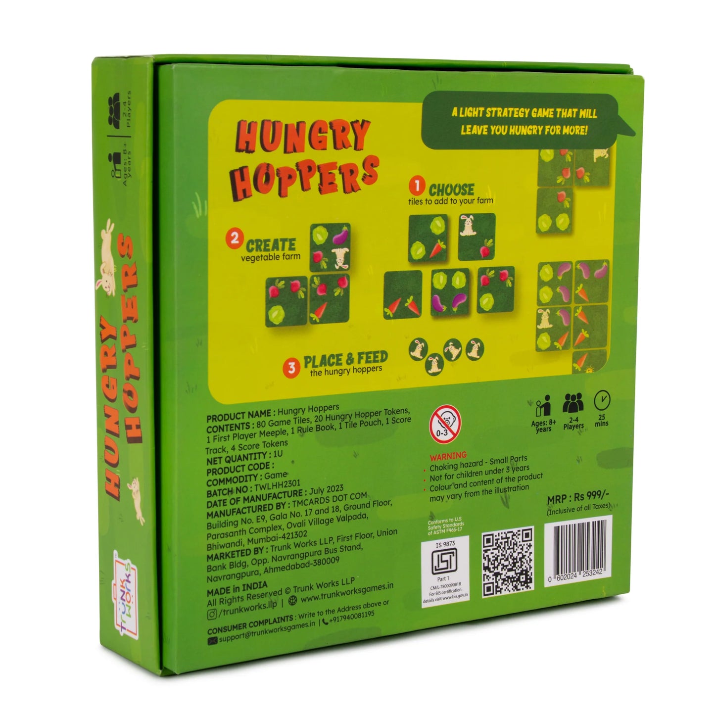 Contents: 80 Tiles, 20 Hungry Hopper tokens, Potli bag, Instruction Sheet, Green Meeple