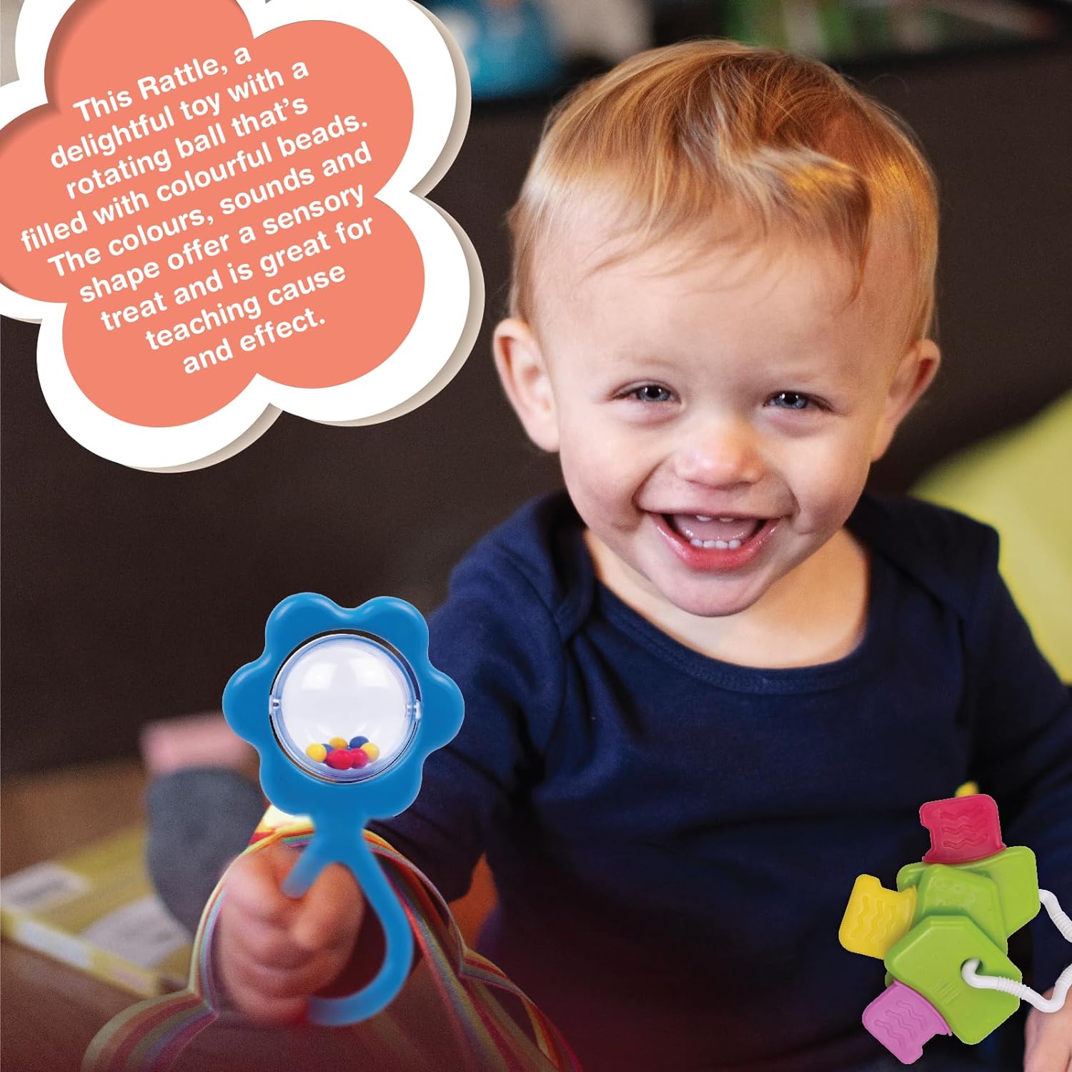 Three amazing toys in one delightful package.. it's their bundle of joy! A top of the line Mini gift set with 3 different Teether, rattles toys. Sunflower rattle - a delightful toy with a central, rotating ball that's filled with colourful beads. The colours, sounds and shape offer a sensory treat and the rattle's great for teaching cause and effect. Now, you don't have to ask babies what their favourite flower is! The key rings- are easily grasped and secured by baby's small fingers. The soft chewable ends of the keys are perfect for comforting baby's swollen gums. This toys helps to stimulate baby's touch, sight and hearing. This teether makes a great first toy for infants. If there's one thing better than friends, it's friends on wheels! That's exactly what Roller Pals is. Baby's rattling companion. An ideal gifting option for new born. Two colour options to choose from"