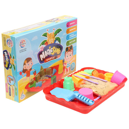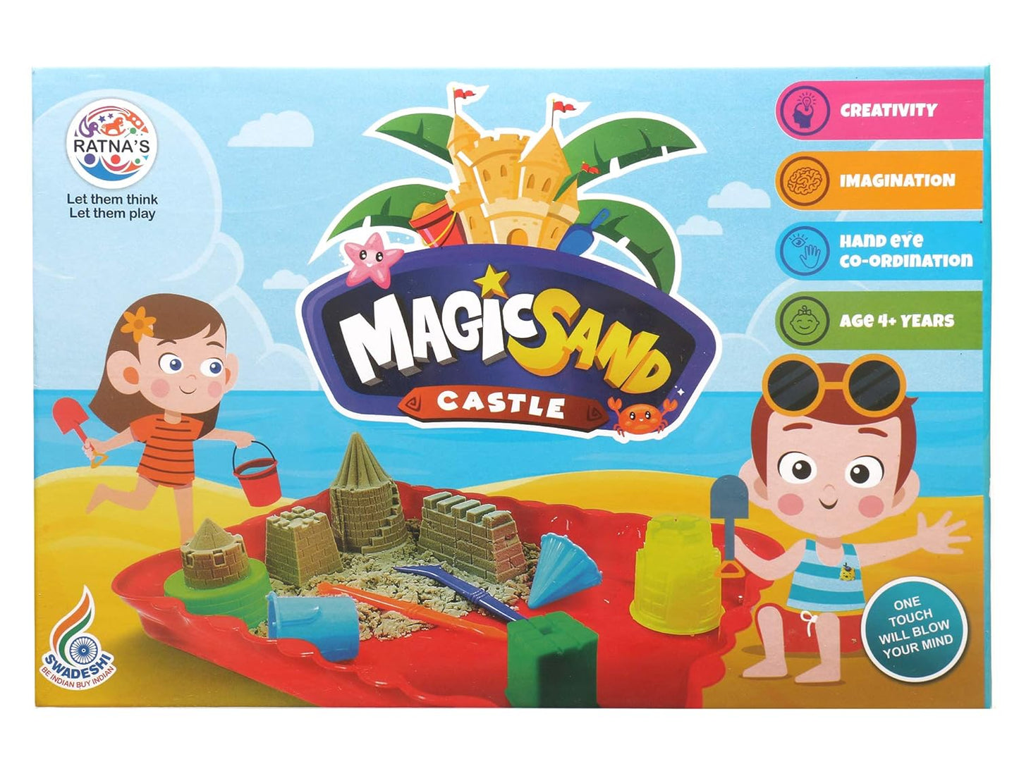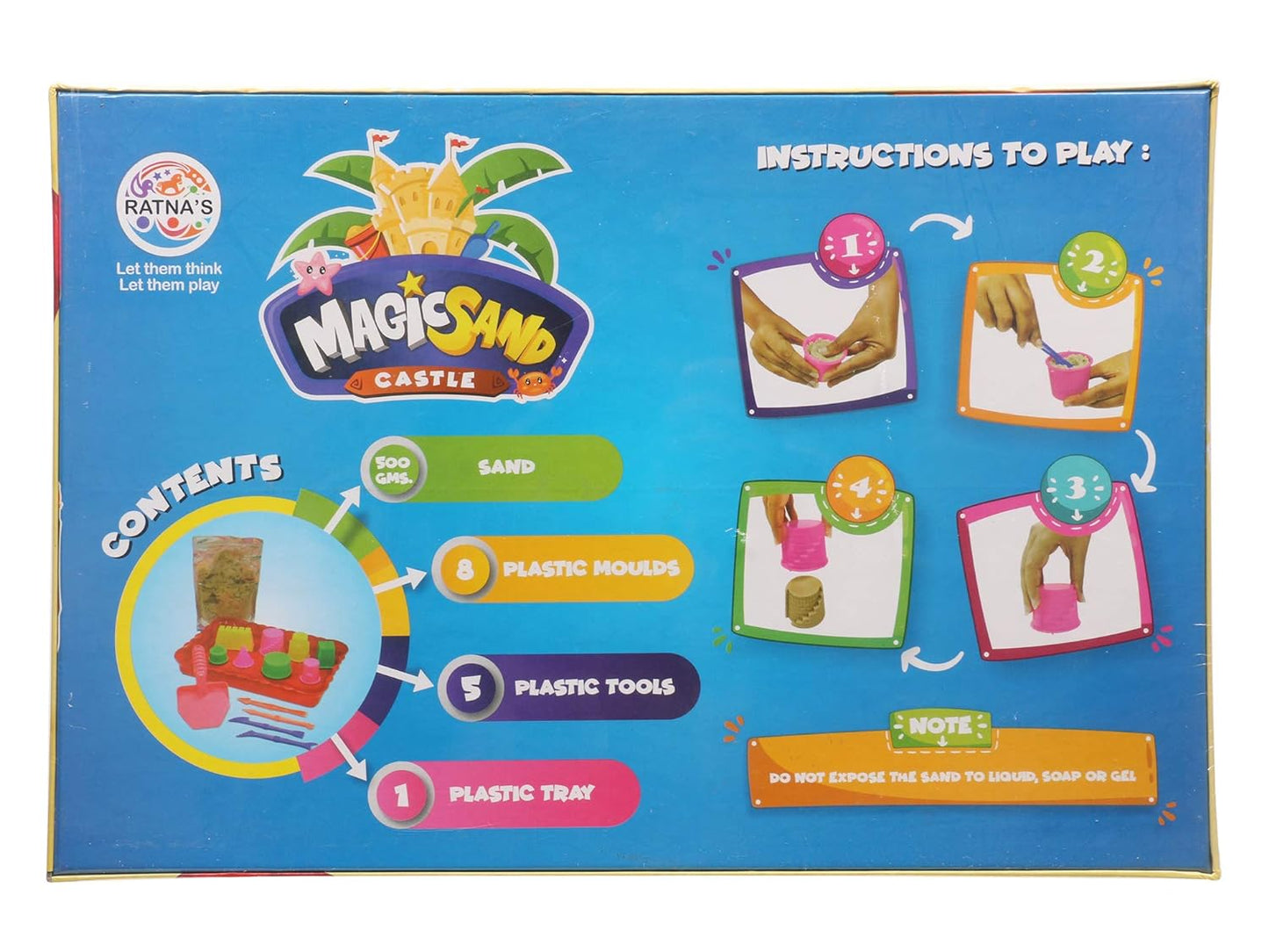 Magic Sand available in 3 variants - Castle, 3D Shapes and Aqua Package Contents: 500gms Sand, 8 Platic Moulds, 1 Plastic Tray, 5 Plastic Tools3D Shapes Moulds Color and Shape Recognition Hand-Eye Coordination Develops Creativity
