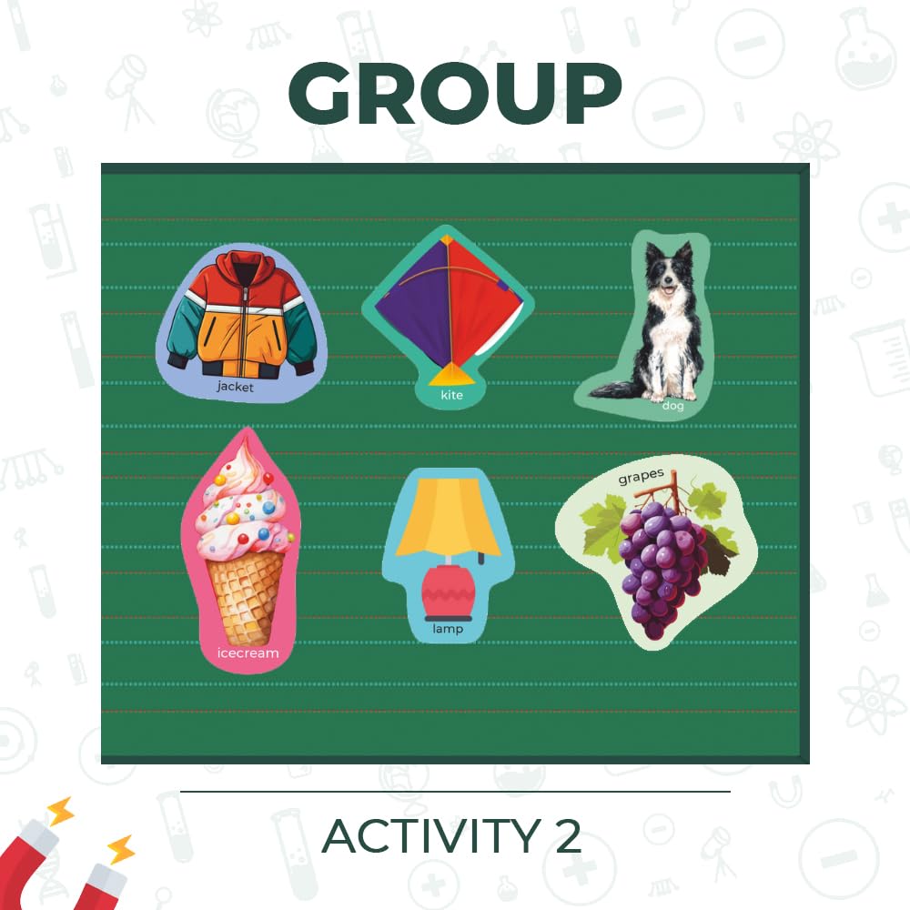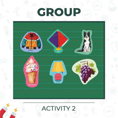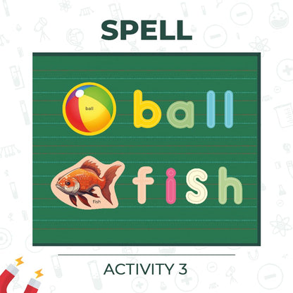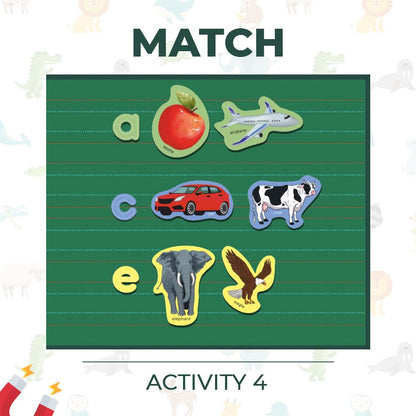 Children begin by identifying and sequencing the alphabet, then move on to matching each letter with its picture tokens. As they progress, they learn to spell simple words using the magnetic letters and finally group pictures by themes such as animals, fruits, or vehicles.