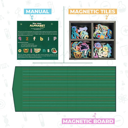 The kit includes a foldable magnetic board, two complete sets of colourful lowercase letters, and 52 picture tokens—two for each letter. Each letter and picture is colour-coded, helping children visually connect letters with their corresponding images like "A for Apple" and "B for Ball."