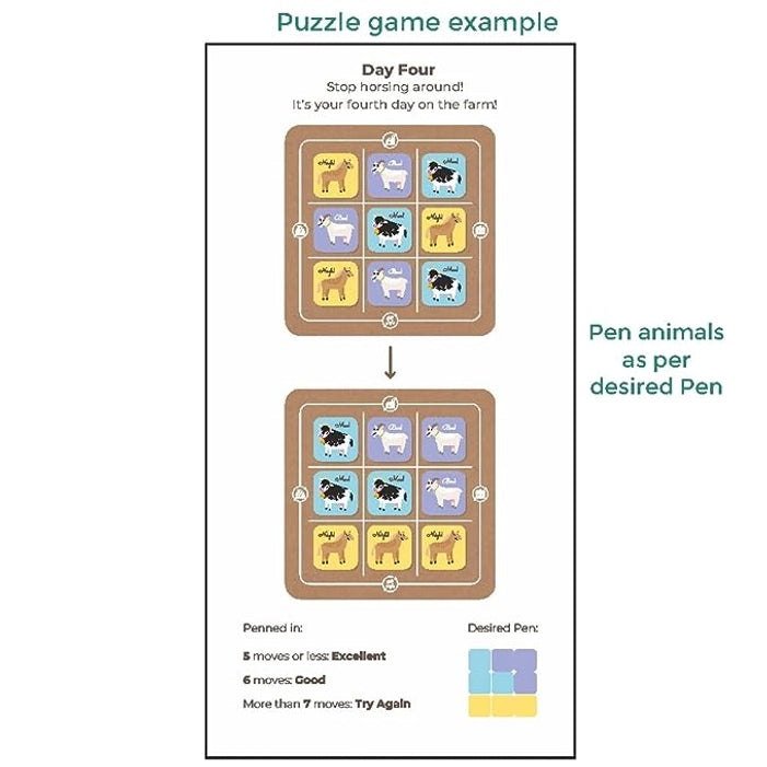 - You swap animal tiles horizontally, vertically or diagonally by the best logic strategy. Keep track of the total number of moves to move the animals in the new designated pen arrangement.