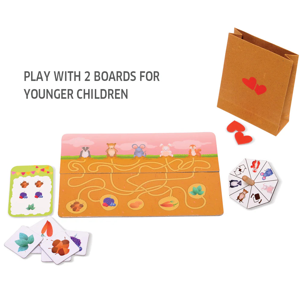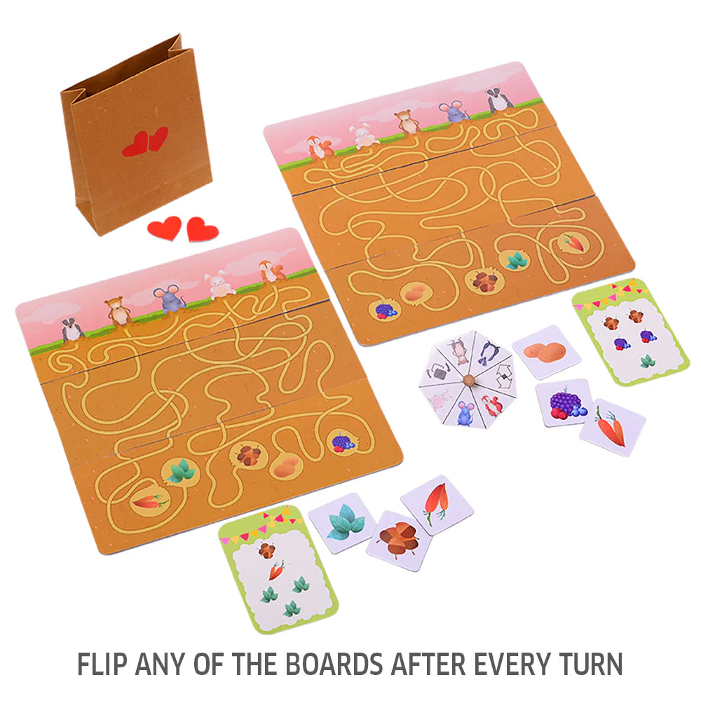Join the Woodland wonder, with a party in the forest. There are orders to be completed. Collect the food as fast as you can in a- maze-ing unique flipping board game! Spin the spinner and let the frenzy begin! It's a game of mental tracking.