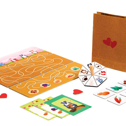 2 animal boards, 2 ground boards, 2 food boards, 1 Wooden Spinner, 20 food tokens, 8 order cards, 2 heart tokens, 1 care paper bag.