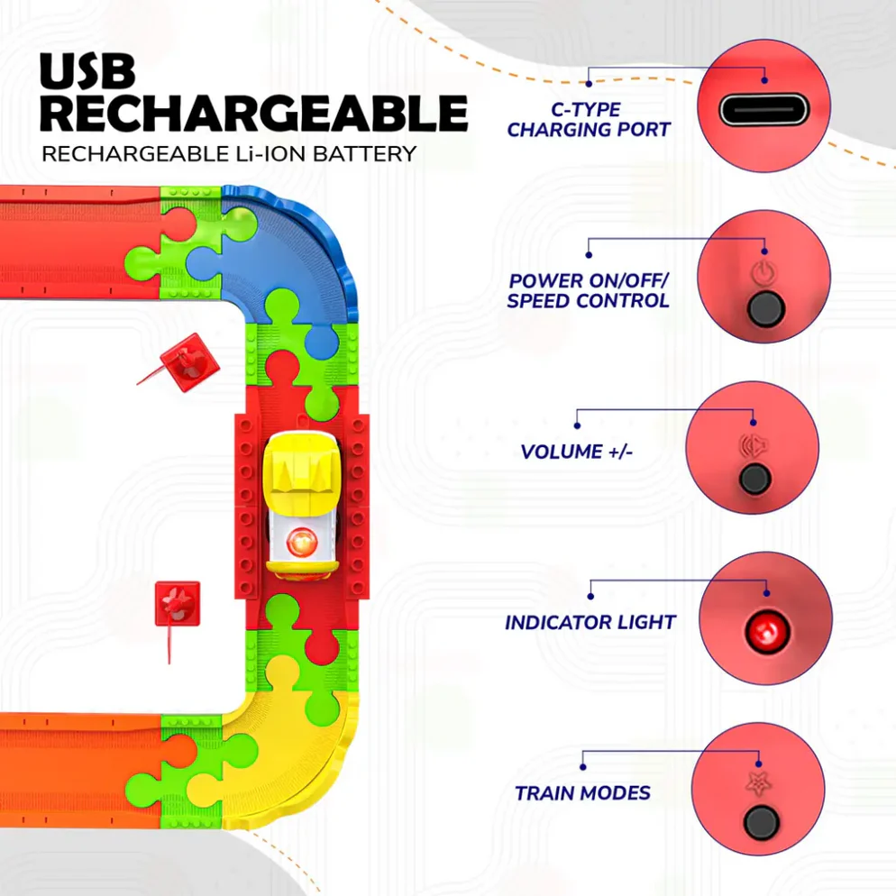 Mirana Block Rider Toy Train Set with Colorful & Multiple Track Layout, USB Rechargeable Type-C Engine, Various Sound Modes - Vande Bharat, Rajdhani, Delhi Metro, Kids