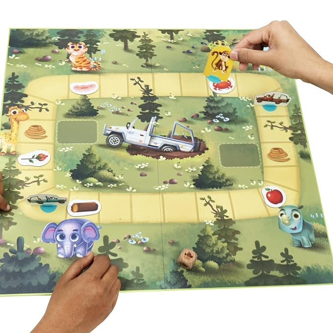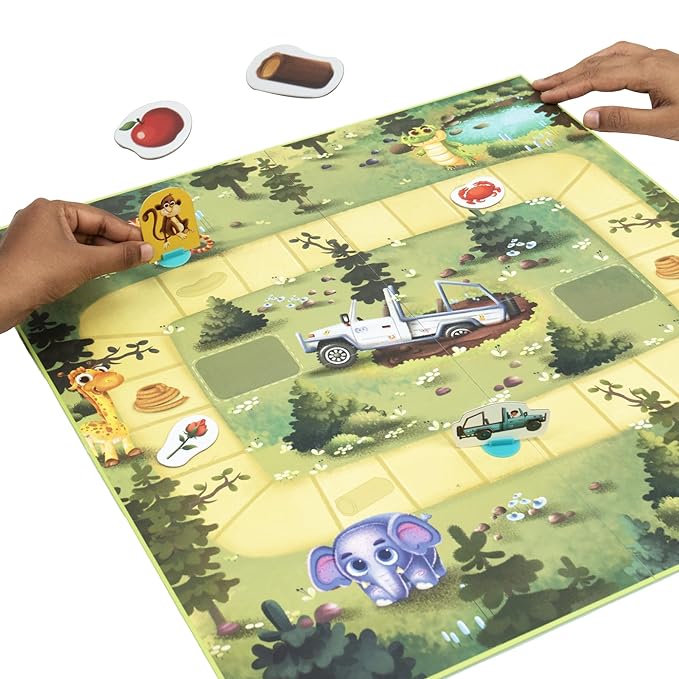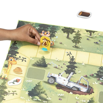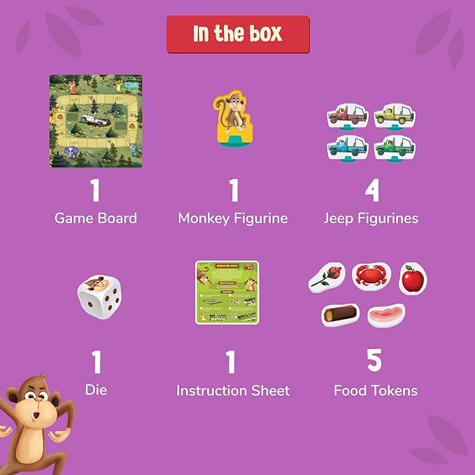 • IN THE BOX - 1 Monkey figurine, 4 Jeep figurines, 5 Food tokens, 1 Game board, 1 Die, 1 Instruction sheet.