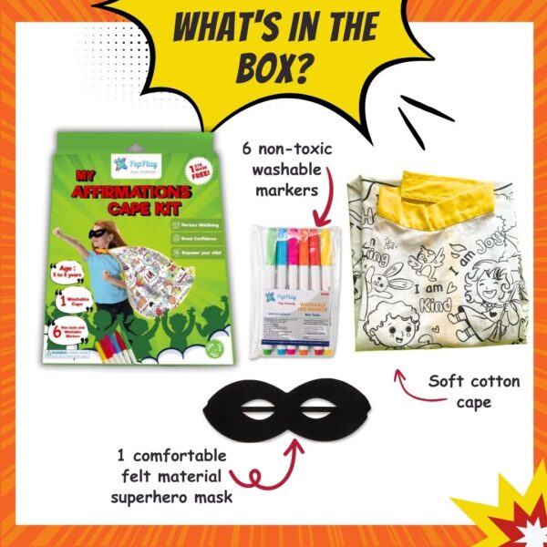 STAINFREE & WASHABLE: Parents can be confident that the PepPlay My Affirmations Cape Kit is safe for their children to use. The non-toxic markers are completely washable and do not stain clothes or furniture. Additionally, the kit is designed to be easy to clean and maintain, ensuring that it can be used again and again for many imaginative adventures.