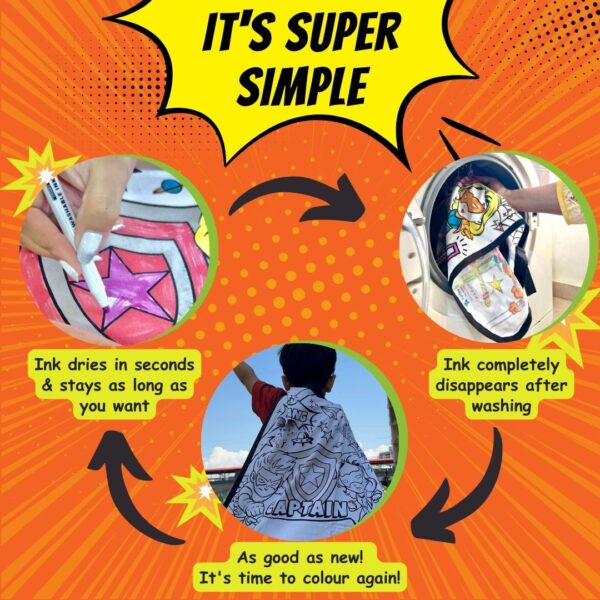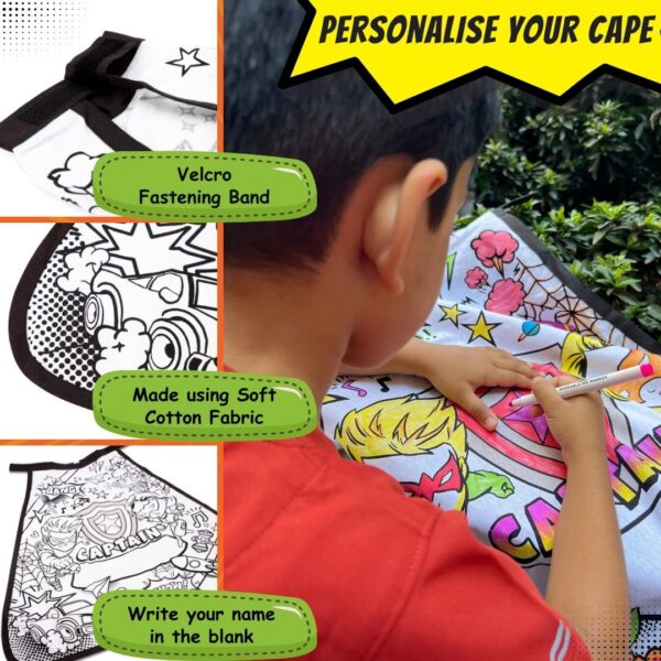 Unveiling a deluxe set featuring a premium-quality cotton cape, effortlessly secured with a comfortable Velcro neck closure. Included are 6 vibrant, washable non-toxic markers that allow young superheroes to personalize their capes. As a bonus, each kit includes a complimentary eye mask to complete the transformation.