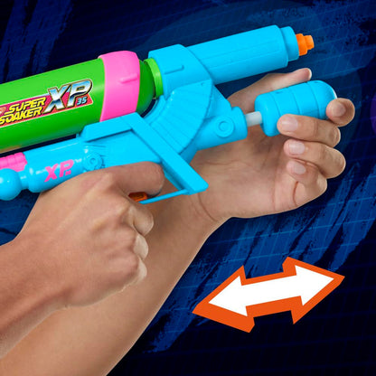 The Nerf Super Soaker XP35 water blaster features a pump-action air pressurized system for a continuous stream of water! The cool retro styling captures the look of Nerf Super Soaker blasters from the past. Go back in time and pour on the fun all over again in drenching water battles! This bright, bold blaster has a removable tank that holds up to 9 fluid ounces (266 milliliters) of water. Pump the handle back and forth to pressurize the air chamber, and pull the trigger to drench everyone with water. Nerf Super Soaker blasters are great kids outdoor water toys and make awesome gifts to get everyone outside for fun, active play that’s a real splash!