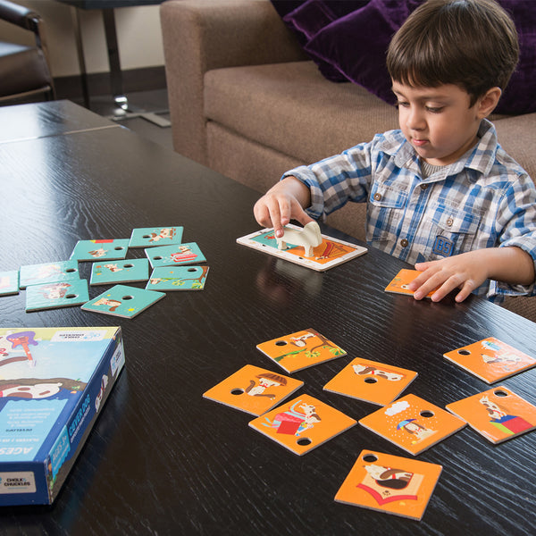 Join the clever dog in a unique opposite pairs self-correcting puzzle game. Find matching pairs of opposites. Check your answers with the help of the clever dog. If his round feet fit neatly into the holes of the tokens, you know you have found the correct matching pair.