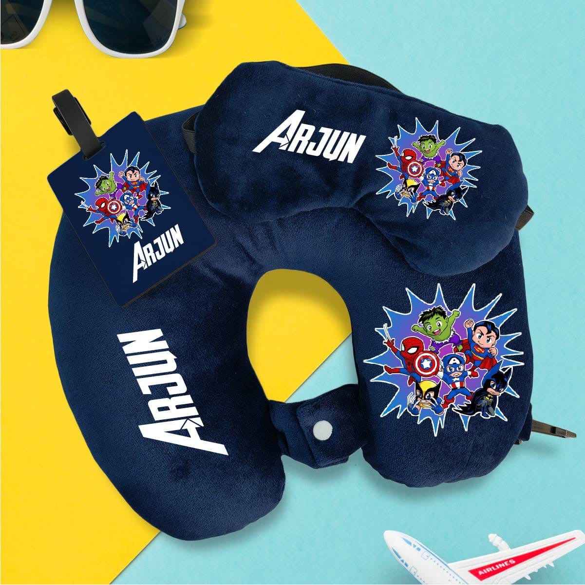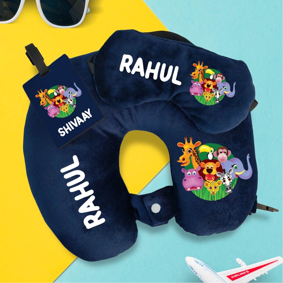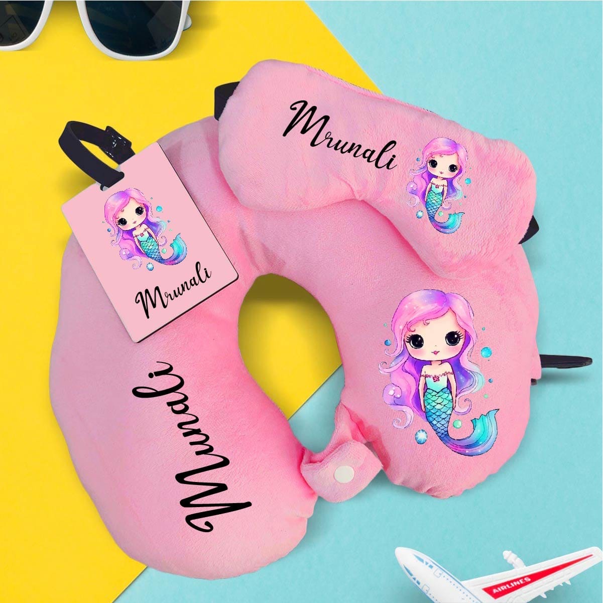 Making time 7 working days before dispatch Can be made in any color and theme Mention name, color and theme in additional comments while checking out *Personalised travel neck pillow n eye mask and Bag tag combo* Colour design available now Travel in style and comfort with personalised travel tag combo 👍Fiber filling 👍Premium quality 👍MDF material bag tag Colors available Navy blue Light pink Light blue Any theme possible