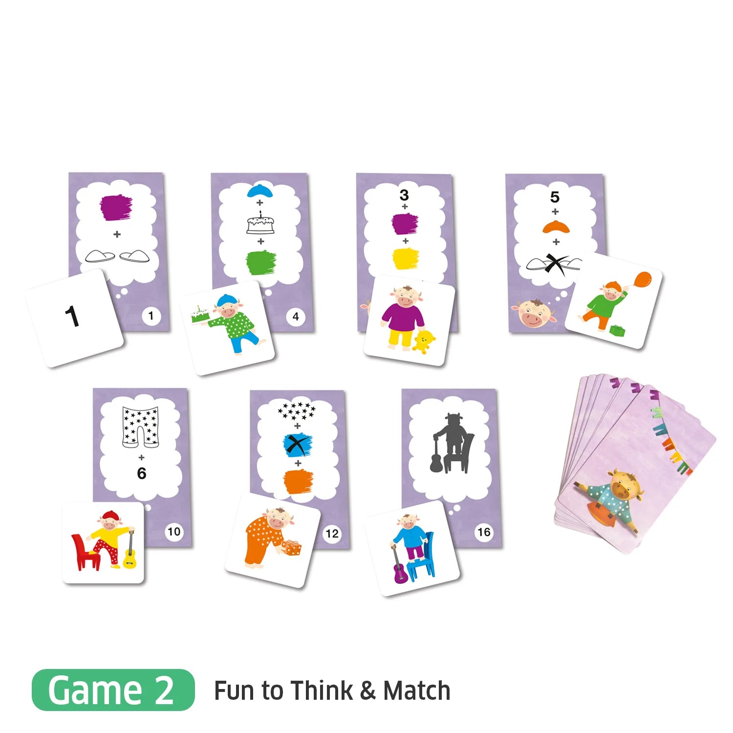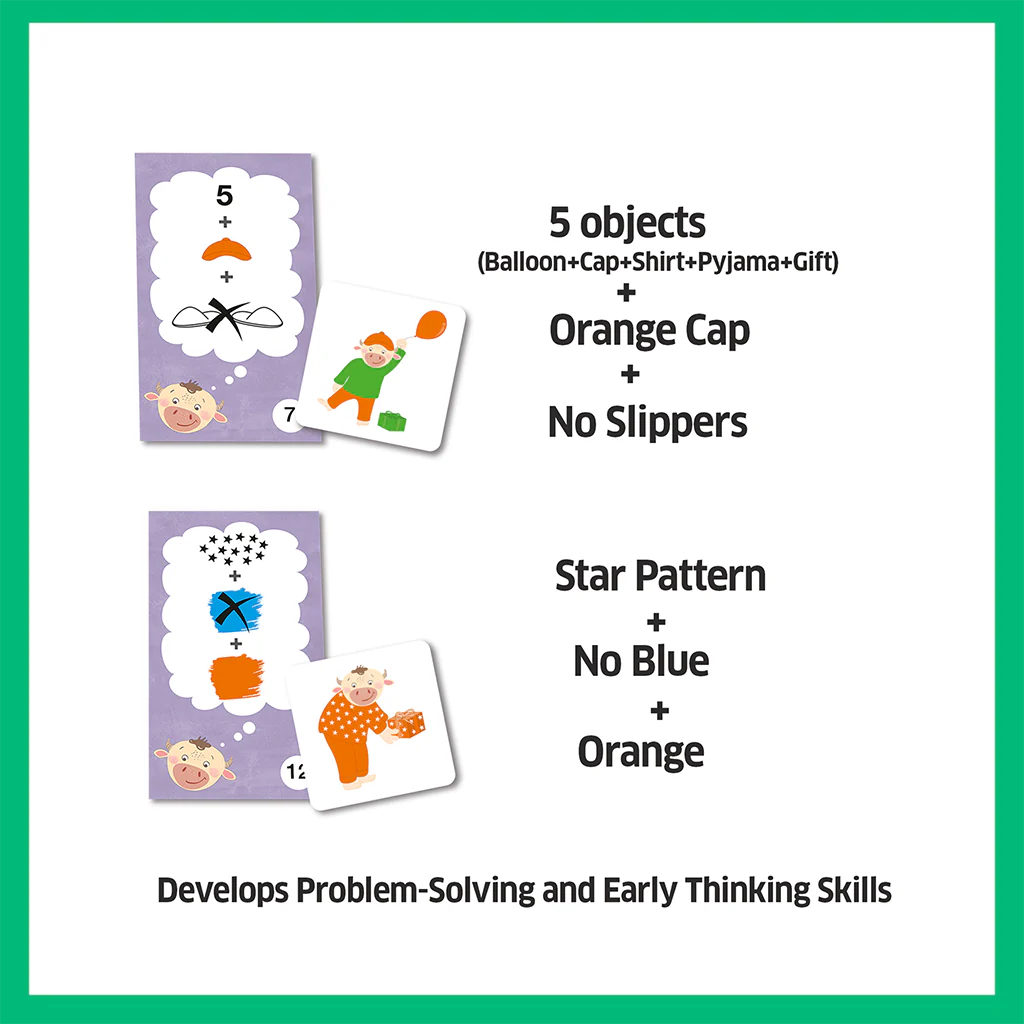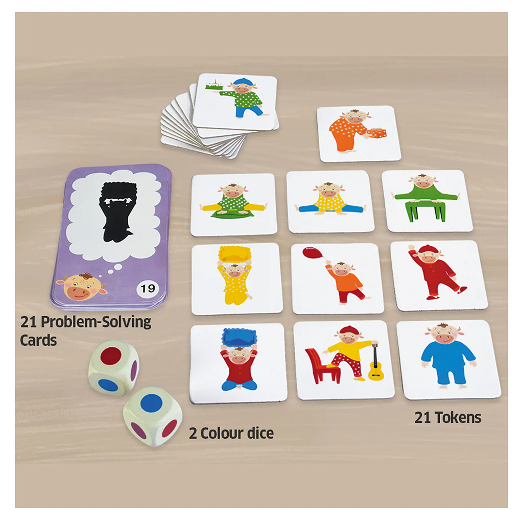 21 Moo’s friends Tokens, 2 Wooden Colour dice, 21 Problem Solving Cards and Game guide