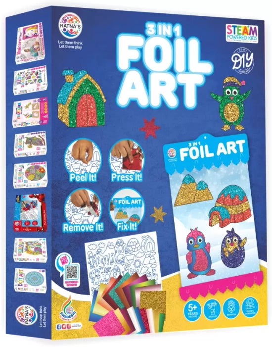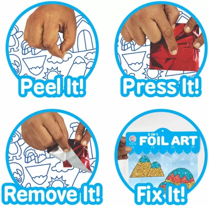 Foil Fun is a magical, mess-free activity for your child to enjoy! It encourages creativity and strengthens fine motor skills. Let their imagination soar as they colour foam stickers with sparkly foil sheets to dress up the characters and create masterpieces! Choose a canvas, use the provided stickers to apply glittery foil sheets, and watch the picture come to life! Children learn vital skills like hand-eye coordination and creative expression while having fun.