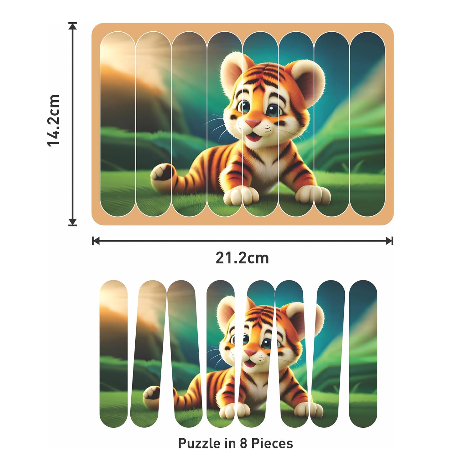- 32 wooden puzzle pieces both side printed used to make 8 puzzles - each puzzle size - 21.2 x 14.2 cm - by arranging 8 wooden sticks in a wooden base frame. 8 sticks walk into a puzzle, and out comes a masterpiece.