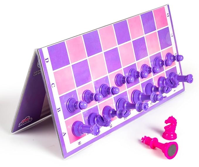 - Well constructed folding magnetic Pink & Purple chess board & chessmen for stable play and easy to move, it has strong attraction to the board and won’t fall down or slide even when you turned the board upside-down or tilt the board straight up.