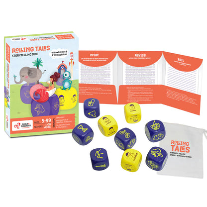 9 Wooden Story Dice, 1 Writing Process Folder with Premium Writing Paper, 1 Cloth Bag for easy Storage & Travel, Sturdy box perfect for storing and gift-giving!