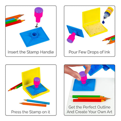 🔹14N Stamps ,1N Stamp Pad ,1N Ink Bottle ,1N Set of Pencil Colours & 1N Stamp Holder.