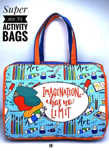 *Super size NX activity bags* *Back in stock* *A complete organiser bag which comes with multiple pockets to keep your art n craft material , stationery n colour s * *Zip pocket to keep your A3 size work sheets * *Main pocket to carry your A3 size books n material * *New feature designed for the first time is an extra compartment to hold your A3 activity board * *Available in 6 beautiful art n craft prints * *Lots of effort s have gone in designing this product n prints *