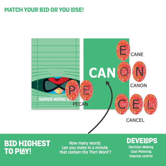 An entertaining brain builder- Win with skill, speed, and confidence. Changing word lengths, thinking in categories and bidding keeps the game exciting.