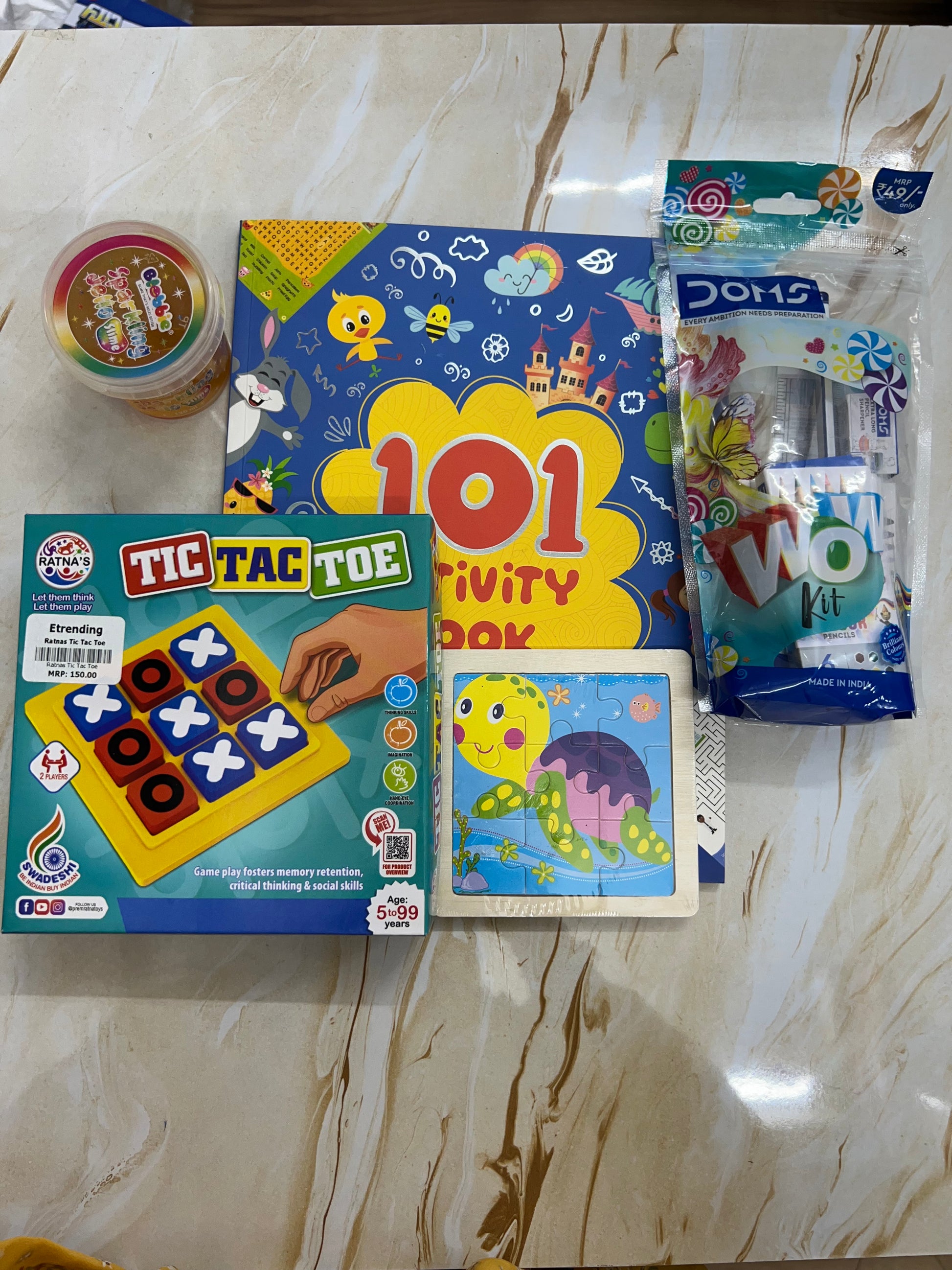 one DoMs wow kit- Pencil, scale, sharpner, eraser, crayons and sketch pen