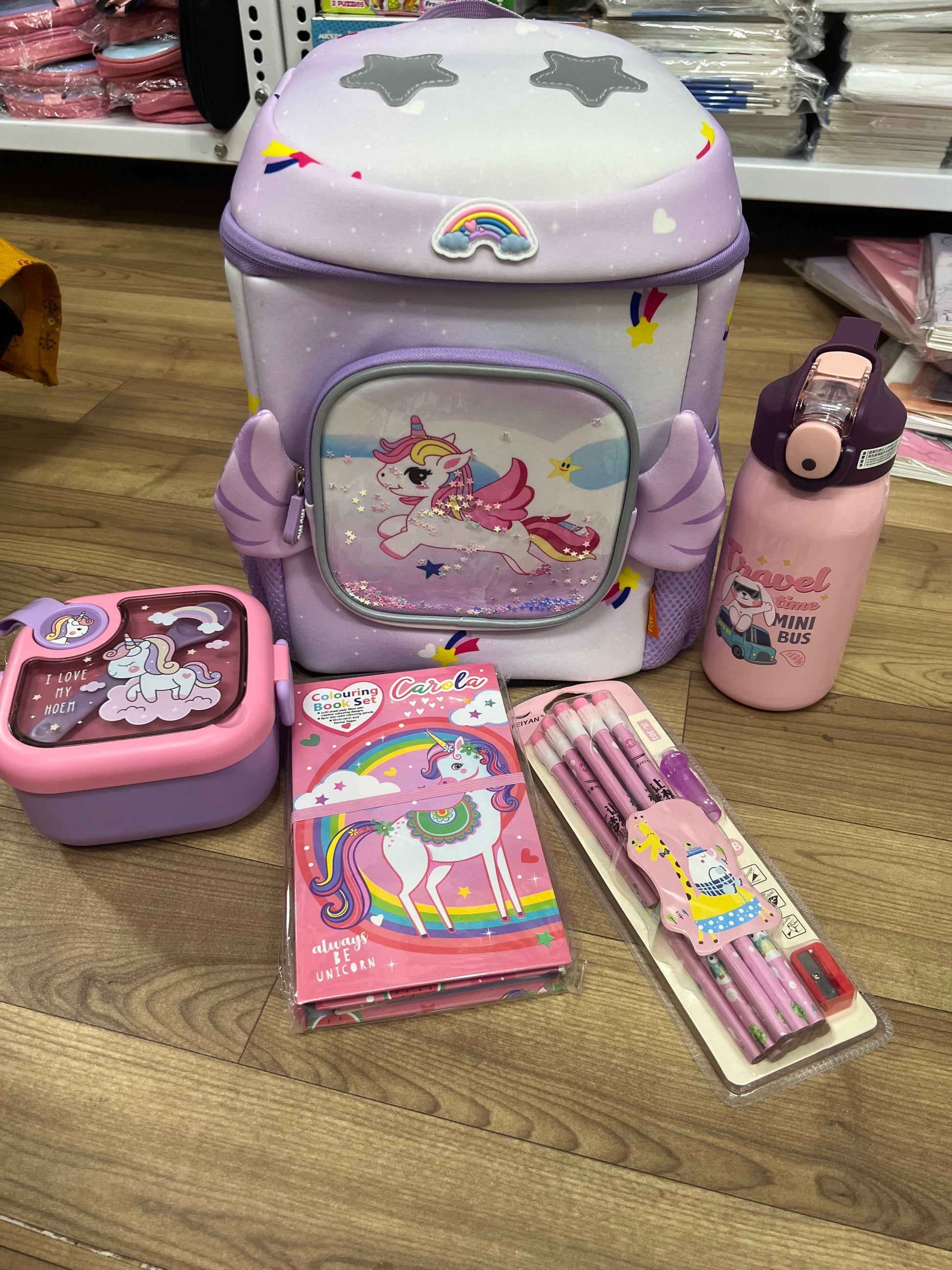 Quality combo wit Unicorn Bag, Unicorn Teeny Tiny Lunch Box, Unicorn Bottle, Unicorn Scratch and Colouring Book and Pencil Set