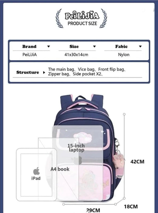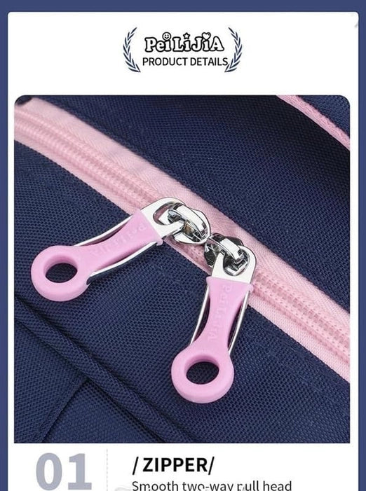 - This large bag with 2 compartments and front pocket will allow your child to easily store all their school supplies. It can slide its bottle into the matching side pocket.