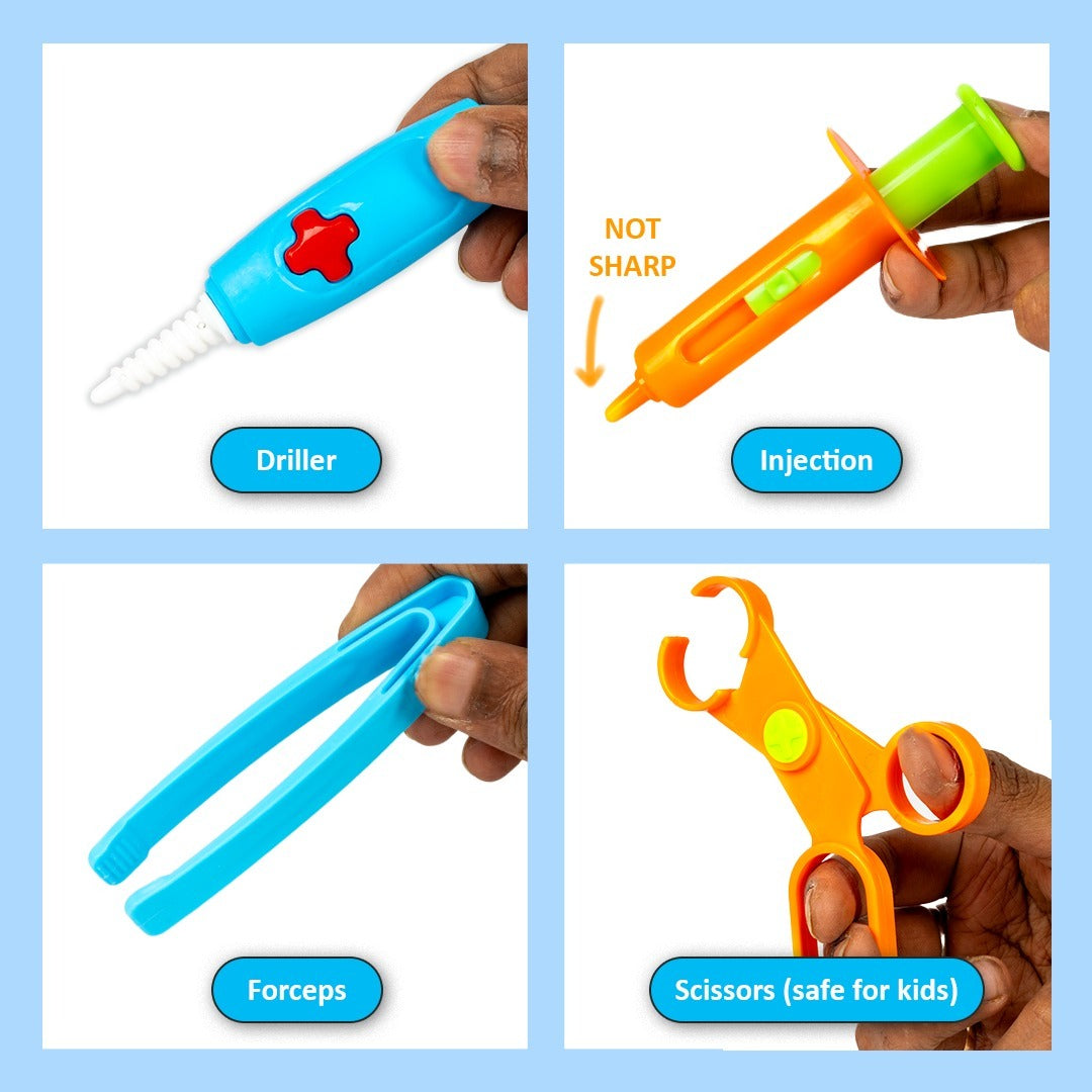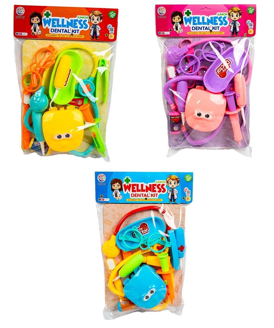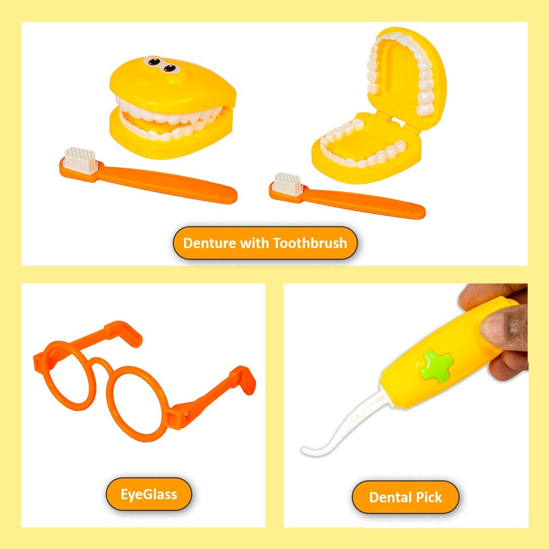 1N Denture, 1N Stethoscope, 1N Toothbrush, 1N Energy drink, 1N Ointment, 1N Injection, 1N Small tray, 1N Plucker, 1N Dental pick, 1N Driller, 1N Scissor.